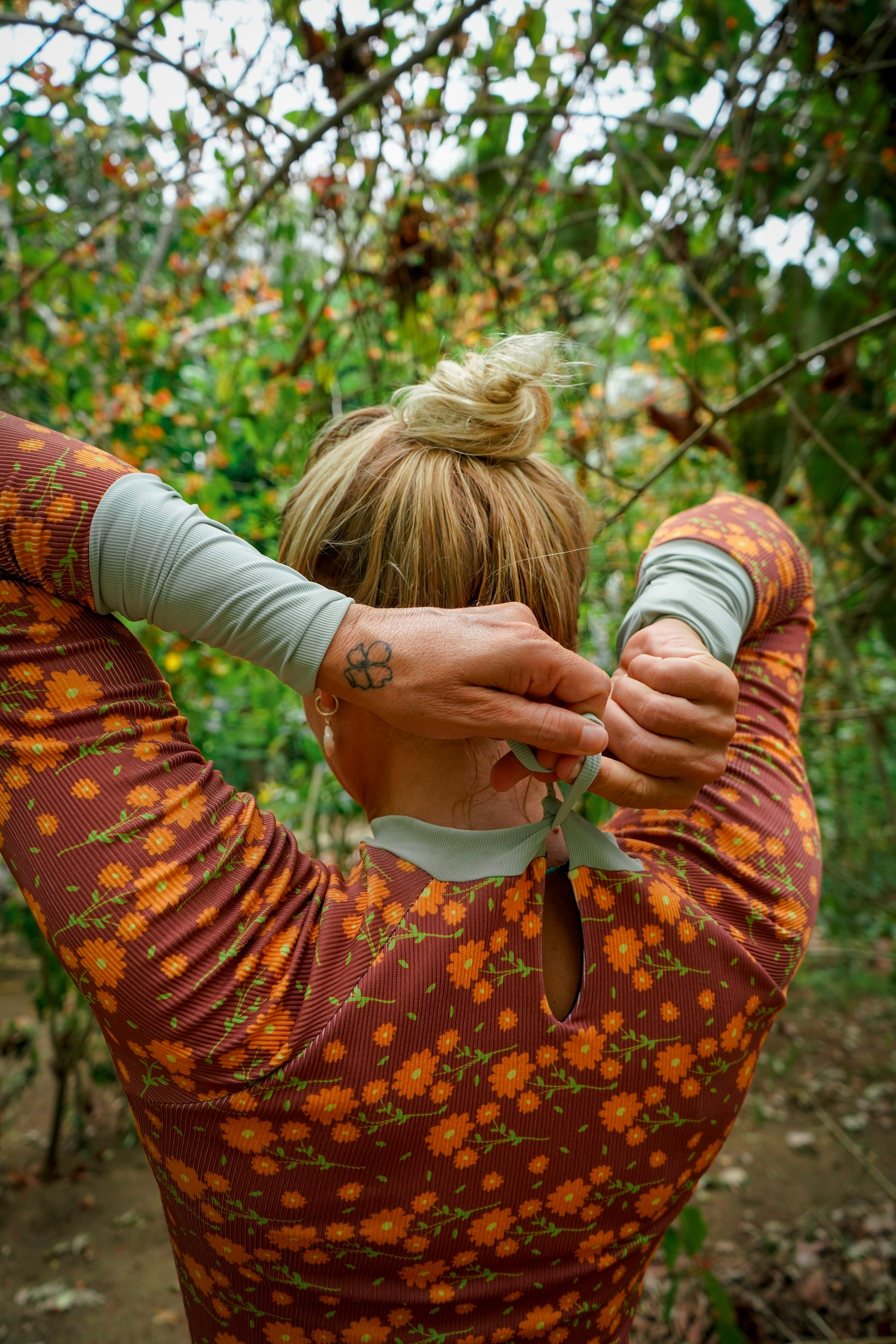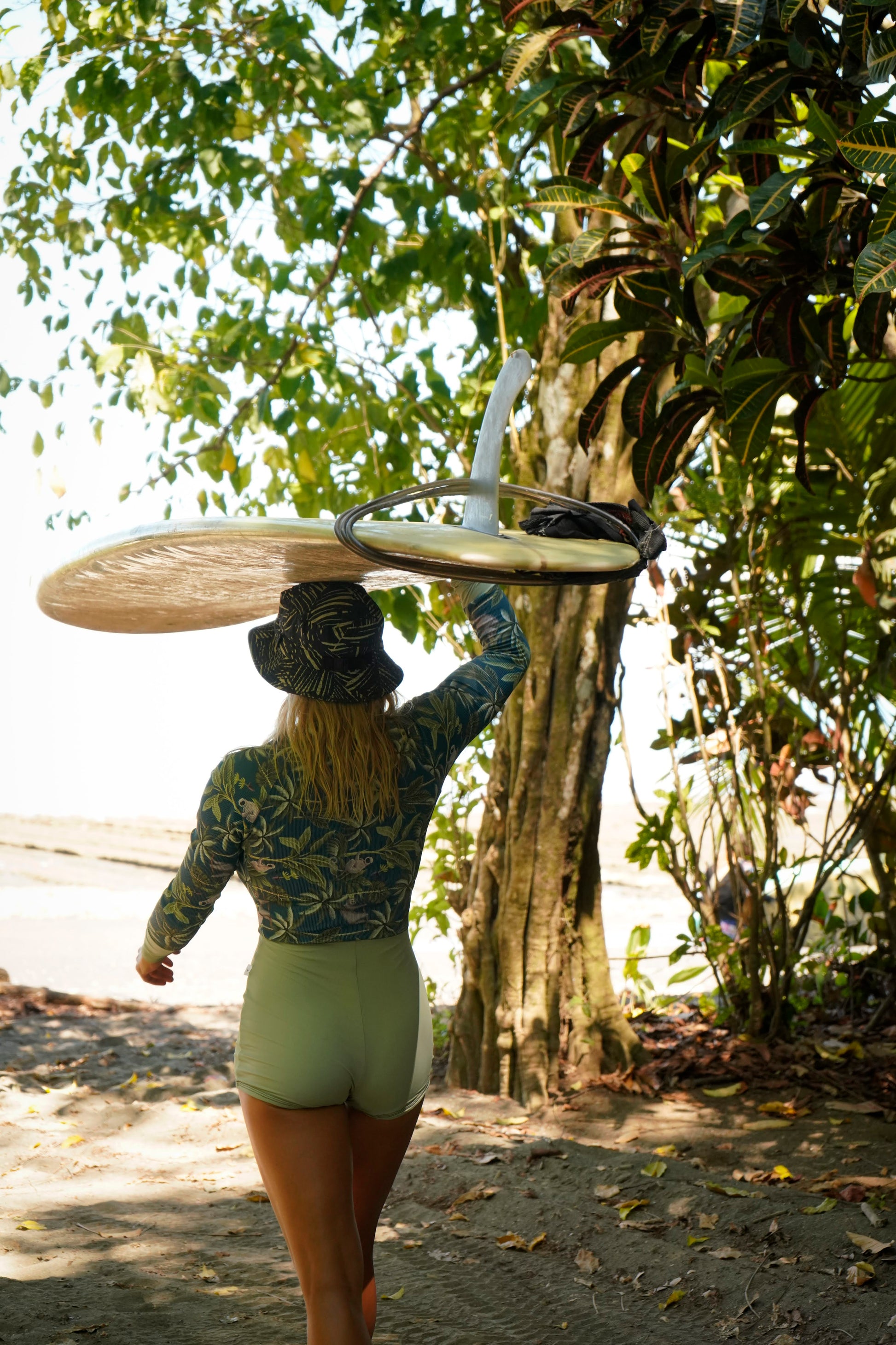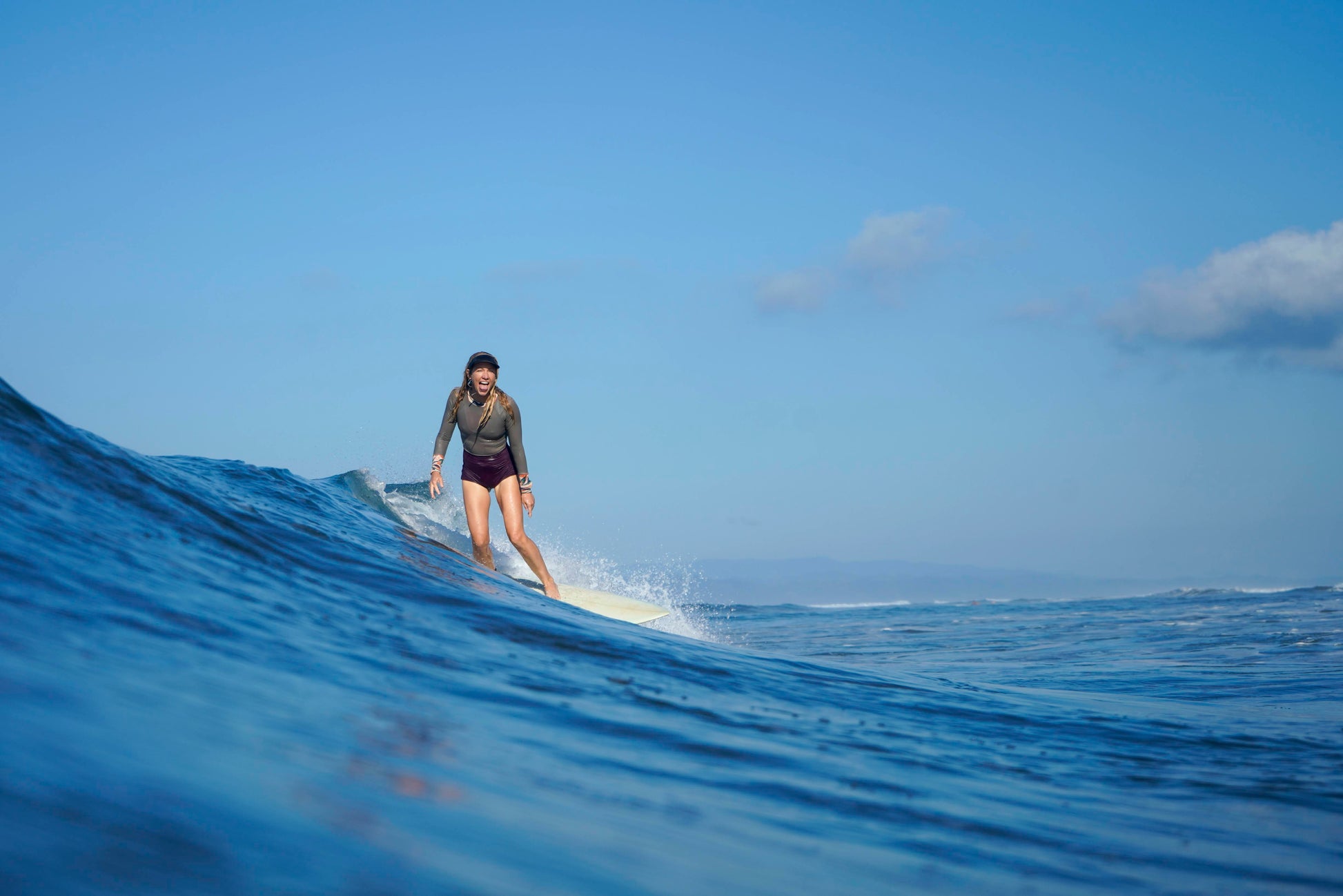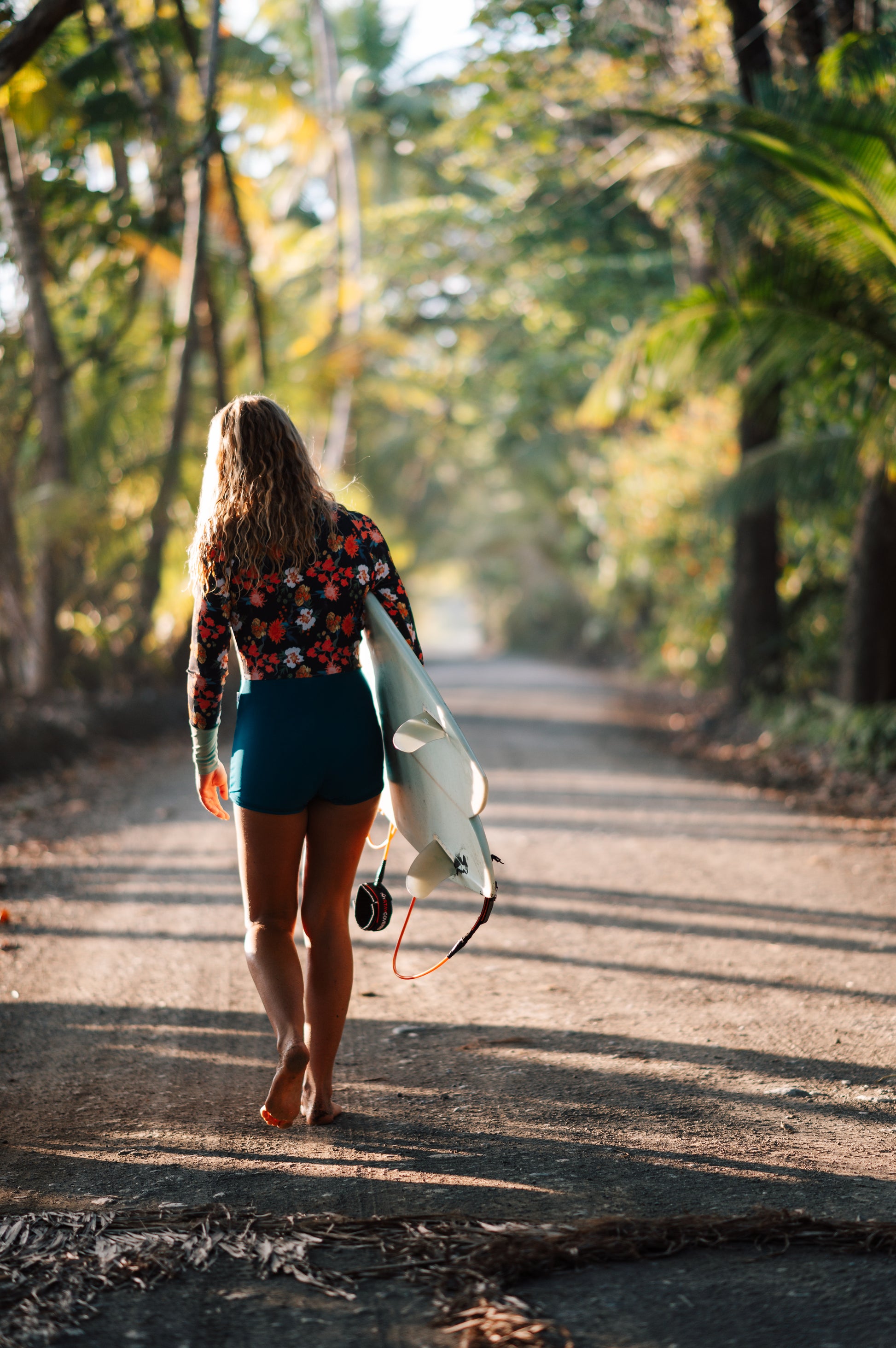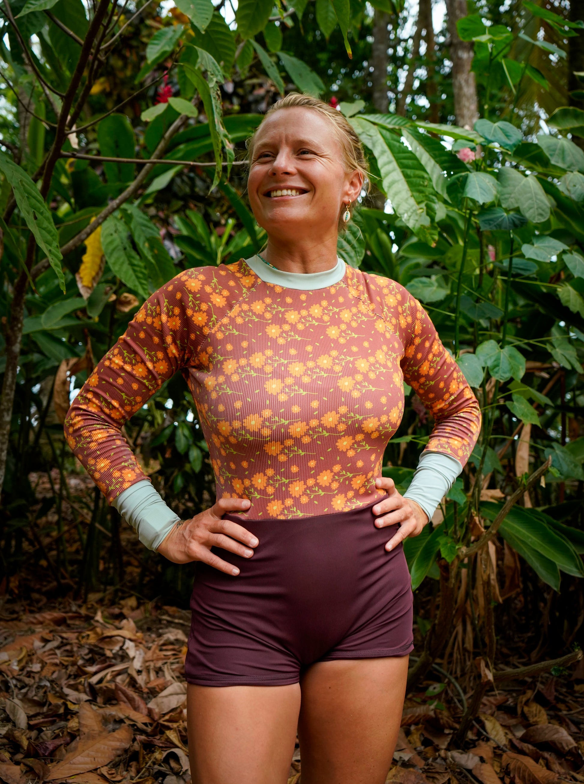 The Playsuit is your go to warm water full coverage surf suit. This suit has been designed with lady surfers in mind. It features double layered shorts that come up to a flattering height just above the hip bones. This suit has just a single layer of fabric on the front panel so you are not slipping around on your surfboard while you paddle for a wave. (Because it is single layered on the top front panel, its best to pair this onesie with the Cami Top or another bikini top underneath for extra chest support.) The long sleeves provide all the sun protection you need so you can stay out in the water as long as you'd like without a worry about getting sunburned. The Playsuit features a tie closure in the back where you slip into the suit through the neck opening.